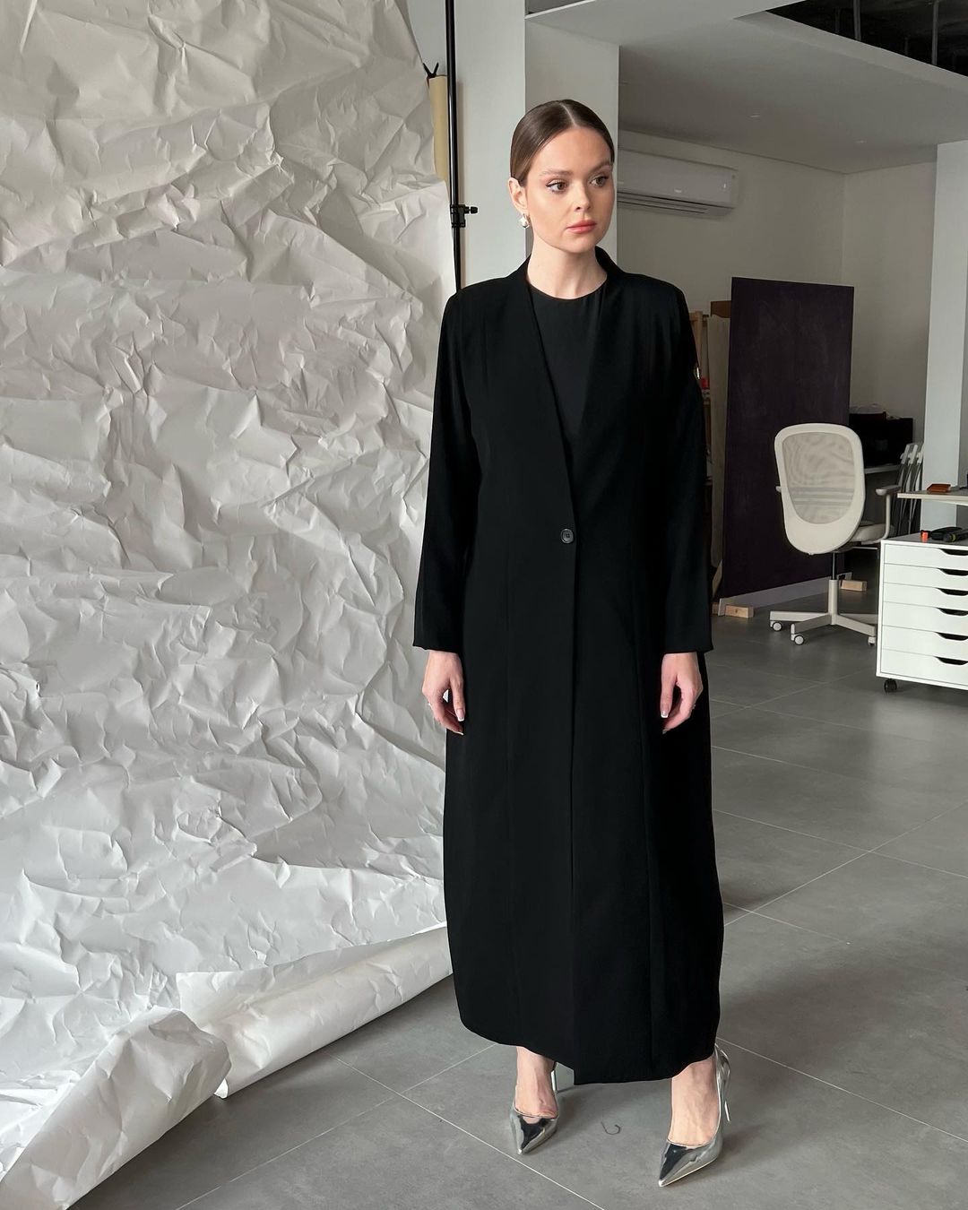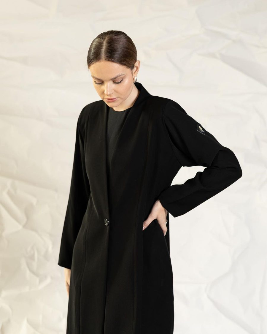 عبايه بقصه البليزر ، بدون ياقه ، مع اضافه ازره تتوفر باللون ( الكحلي ، البني ، الاسود ، الماروني )