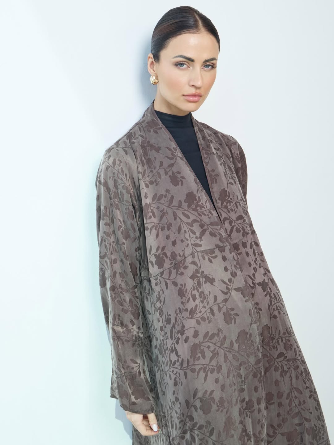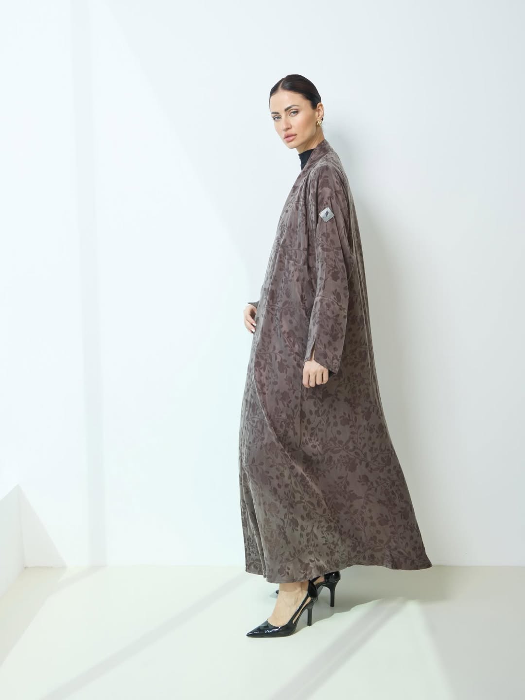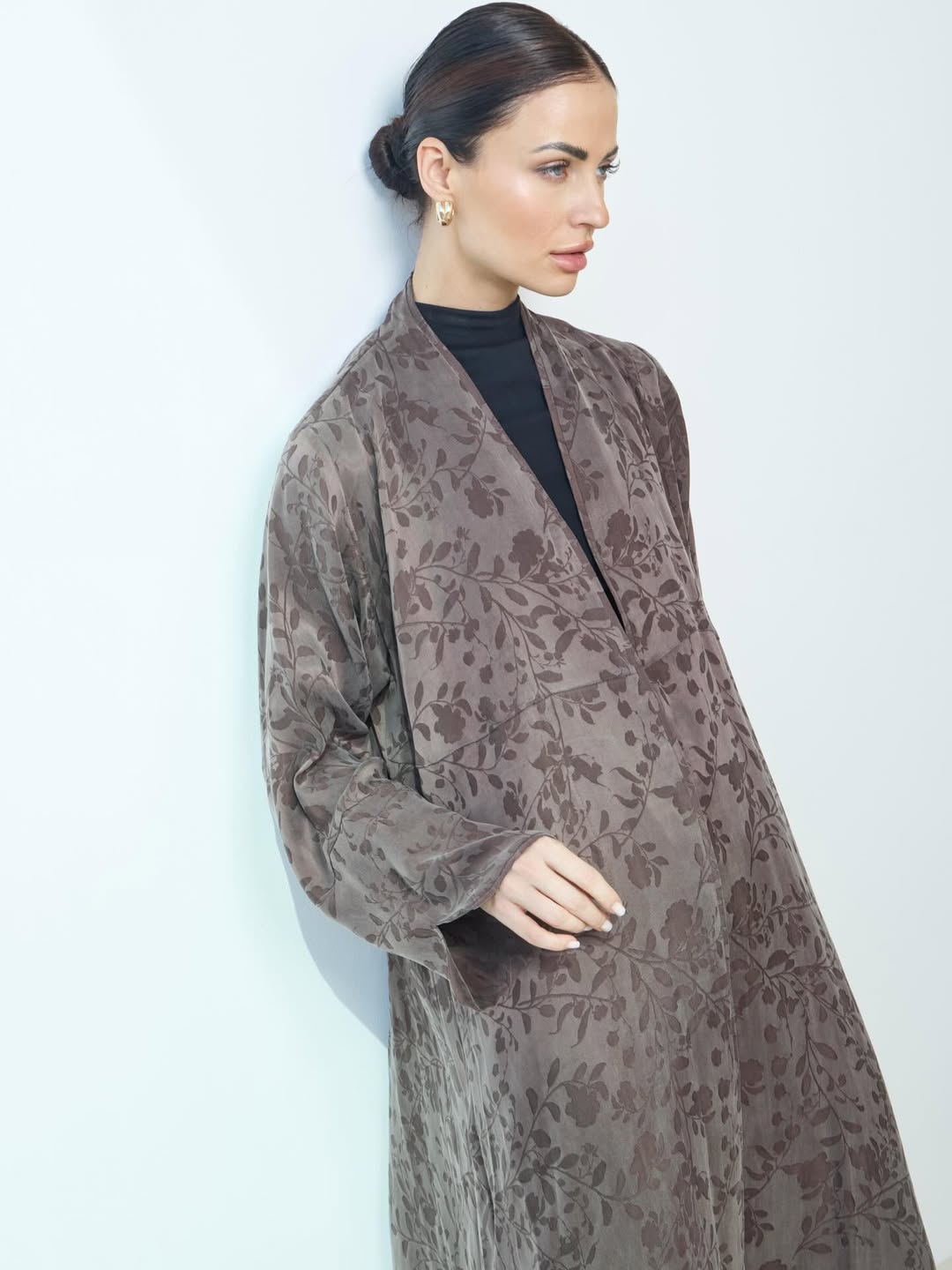 عبايه بقماش الحرير التركي ، بطبعه جميله مع اضافه قصَه لاعطاء العبايه اكث جماليه ، تتوفر باللون البني / البيج / الاسود